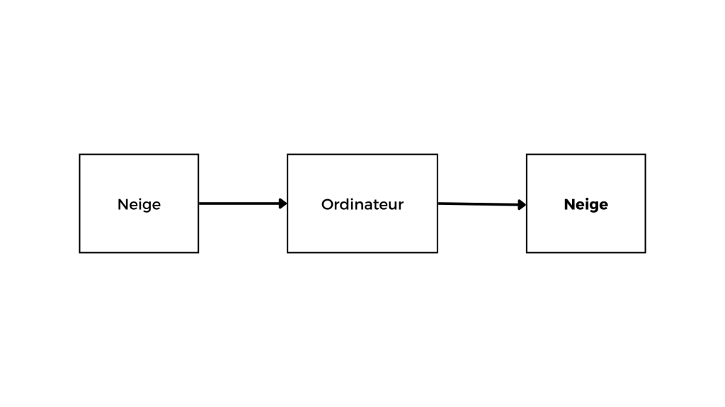 Mettre un lien entre la neige et l’ordinateur signfie avoir quelque chose de binaire que l’ordinateur va traiter avec un programme et va ressortir un nouveau binaire toujours en lien ave la neige.